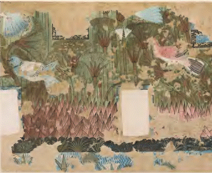 Die unnatürliche Dekoration, Tauben in einem Papyrus-Dickicht, wird