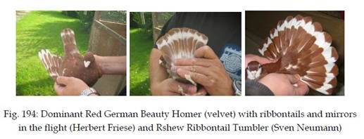 Abb. 5: Links und Mitte rot Deutsche Schautaube, rechts Rschewer